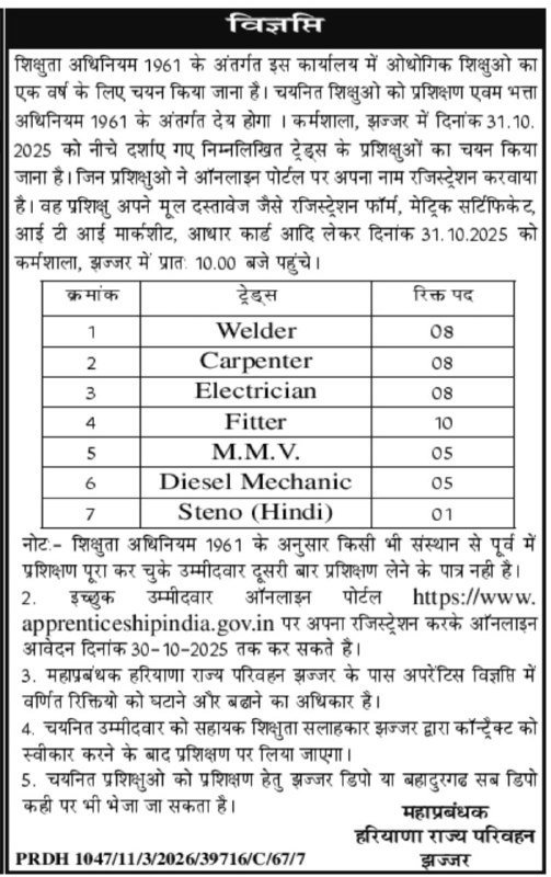 hartrans.gov.in Haryana State Transport Department, Jhajjar Haryana Roadways Jhajjar Apprentice Recruitment 2025, Eligibility, Fee, Last Date, Apply Online, Authority has released the New Notification for the recruitment of Haryana Roadways Jhajjar Apprentice Apprentices New Vacancy 2025 for 45 Posts, Haryana Roadways Jhajjar Apprentice Online Registration Form 2025 has started from 25 October 2025 to 30 October 2025 through the official website of the Authority. The candidates who are interested for Haryana Roadways Jhajjar Apprentice Bharti 2025, Kindly read the full notification related to Haryana Roadways Jhajjar Apprentice Jobs 2025. Check Eligibility, Application Fee, Age Limit, Salary, Selection Process and all other information, All the details related to Haryana Roadways Jhajjar Apprentice Online Registration Apprentice Posts Application Form 2025 Link is given below.