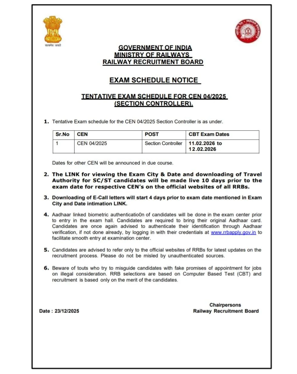 - Make sure to carry a printed copy of your RRB Section Controller Hall Ticket 2026 to the examination hall, along with a valid photo ID.